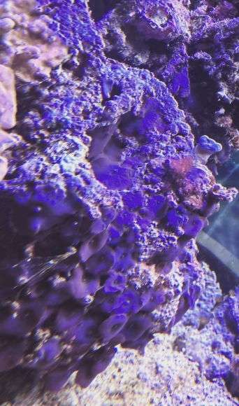 mind. 30 blaue Scheibenanemonen + kleine rote Montipora + kleine Pilzlederkoralle auf Riffgestein