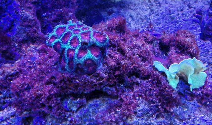 Pavona spez. (grüne Kaktuskoralle) + Favia spez. auf Riffgestein