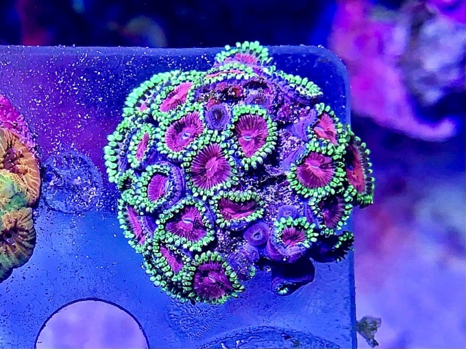 Ich biete hier einen sehr großen Ableger meiner Zoanthus Pink Diamond mit mind. 30 Polypen an. Die Zoas haben eine intensiv pink gefärbte Mundscheibe. Dazu kommen noch grün und gelb fluoreszierende Tentakeln.